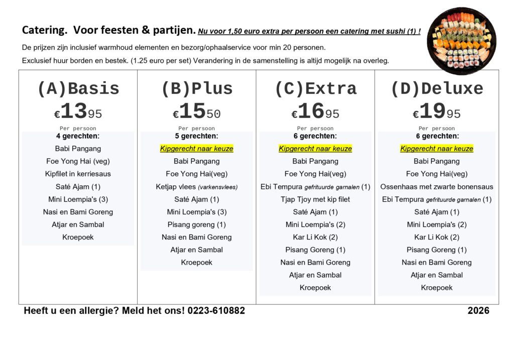 Zodra u zich aanmeld houden wij u op de hoogte met toekomstige aanbiedingen en/of menu aanpassingen voor heerlijk dineren!